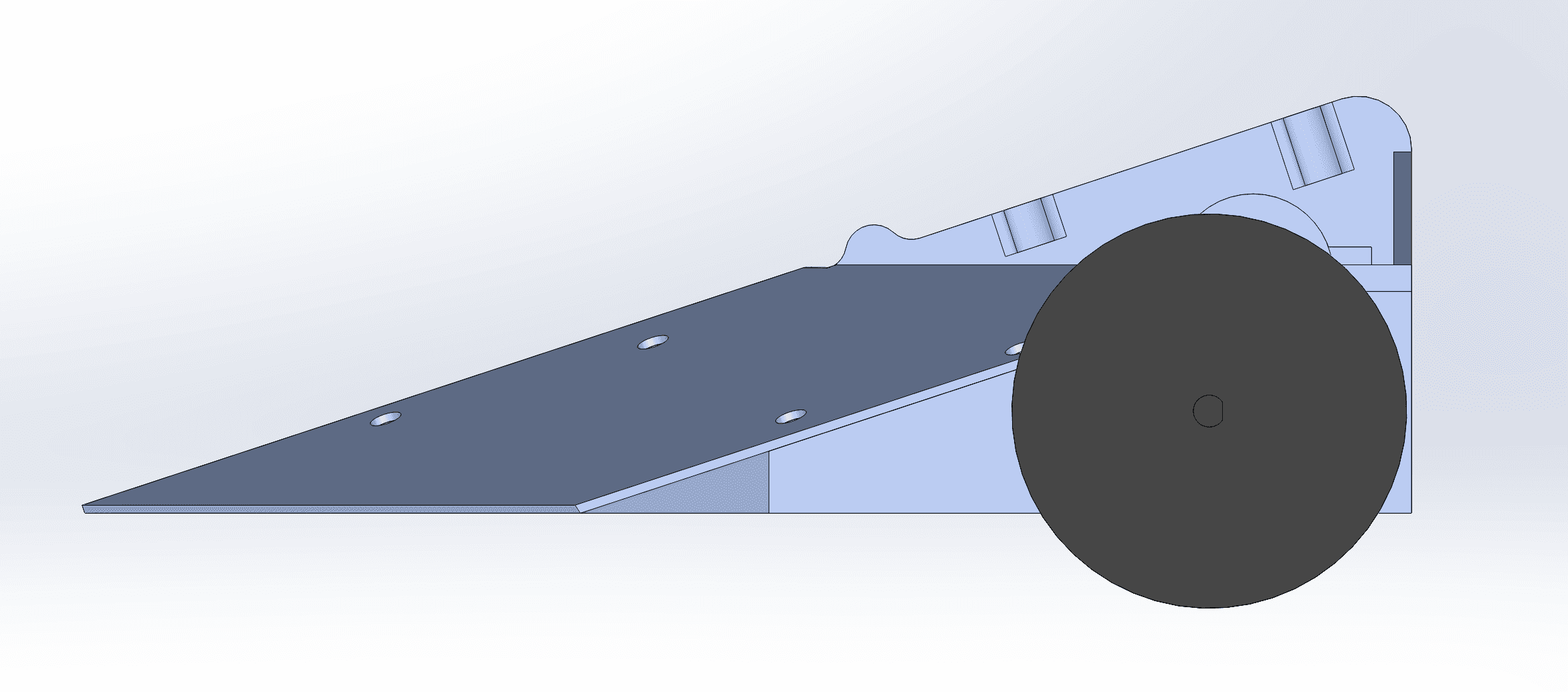 I designed a chassis for the 1lb weight class of the Advanced Robotic Combat team's training program: PLANT. The weapon for the robot flips other robots on their back, rendering them immobile. In order to allow enough space for the flipping mechanism while also being secure, I designed an innovative slanted chassis.